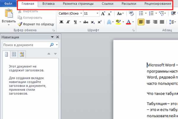 Перед тем, как разбираться с табуляцией, необходимо включить в редакторе особый инструмент, именуемый линейкой. Для начала обратите внимание на верхние вкладки в Ворде («Главная», «Вставка» и т.д.). Настройки, необходимые для работы с текстом, расположены в этих вкладках, а сами вкладки отсортированы по виду выполняемых функций.