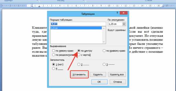 Чтобы установить несколько позиций табуляции, используя диалоговое окно, выберите в нем первую позицию, выравнивание и заполнитель, затем нажмите «Установить». По такому примеру сделайте нужное количество раз и нажмите «ОК».