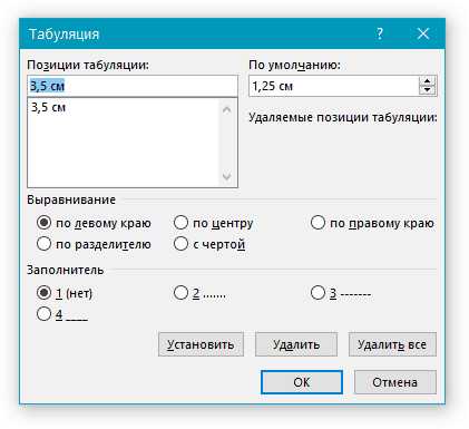 Если настройка позиций табуляции с помощью линейки не обеспечивает необходимую точность или перед позицией табуляции требуется вставить специальный символ (заполнитель), воспользуйтесь диалоговым окном «Табуляция
