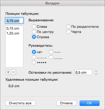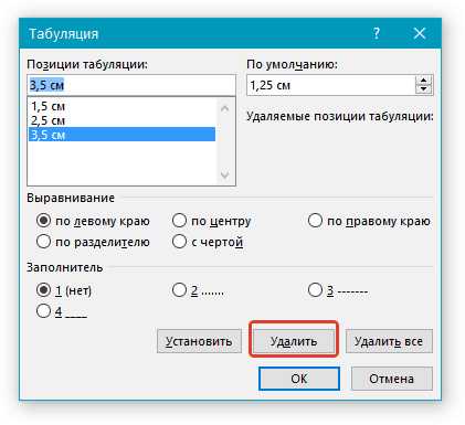 В списке Позиции табуляции щелкайте каждую позицию, которую нужно удалить, а затем знак «минус» (–). Чтобы удалить все позиции табуляции, нажмите кнопку Очистить все.