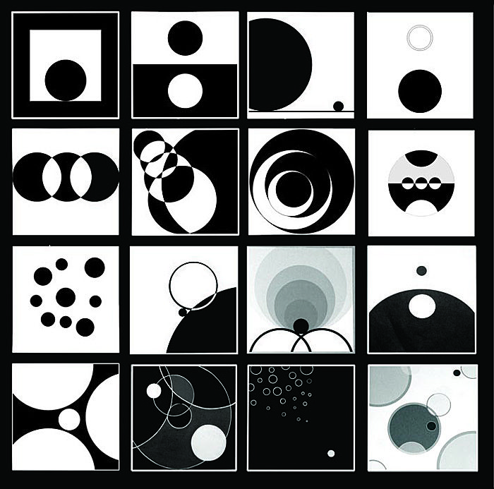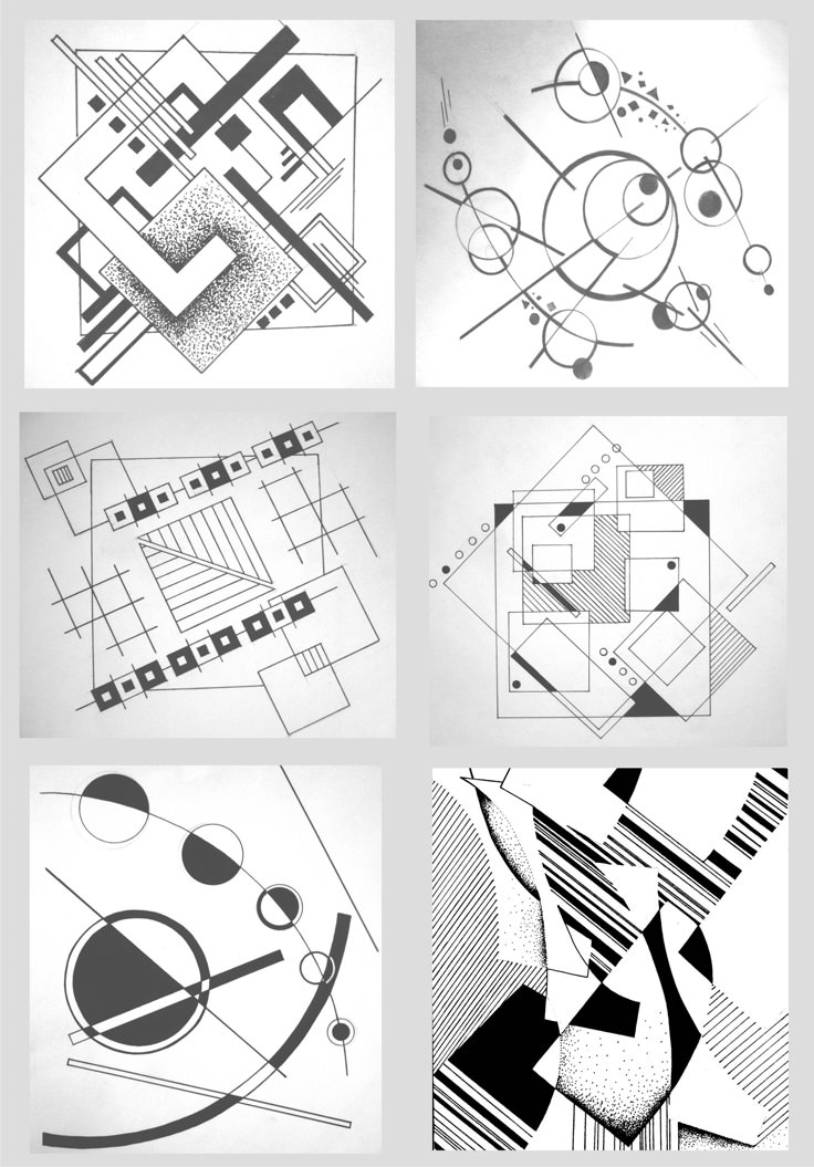 Поскольку в композициях, которые я нарисовал, было много элементов, я попробовал несколько композиций с очень небольшим количеством линий и точек. Это было сложно, но весело. Я вырезал кусочки линий и точек и закрасил квадрат черным цветом, чтобы составить эти композиции. Это казалось проще, и идеи текли быстрее по сравнению с ним.