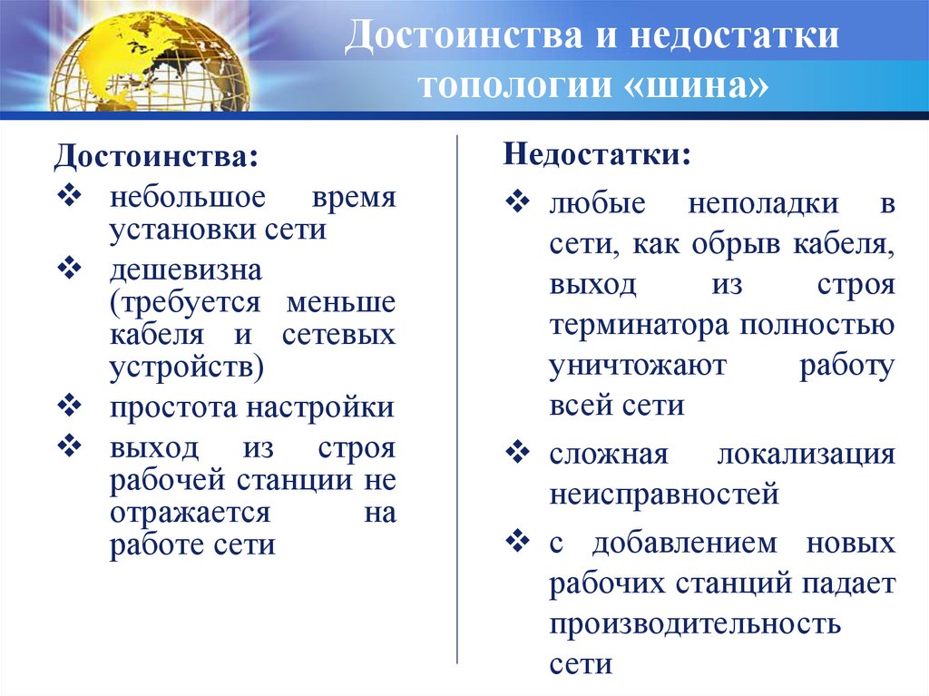 | Отказ одного узла не влияет на работу остальных узлов | Ограниченная длина кабеля |
