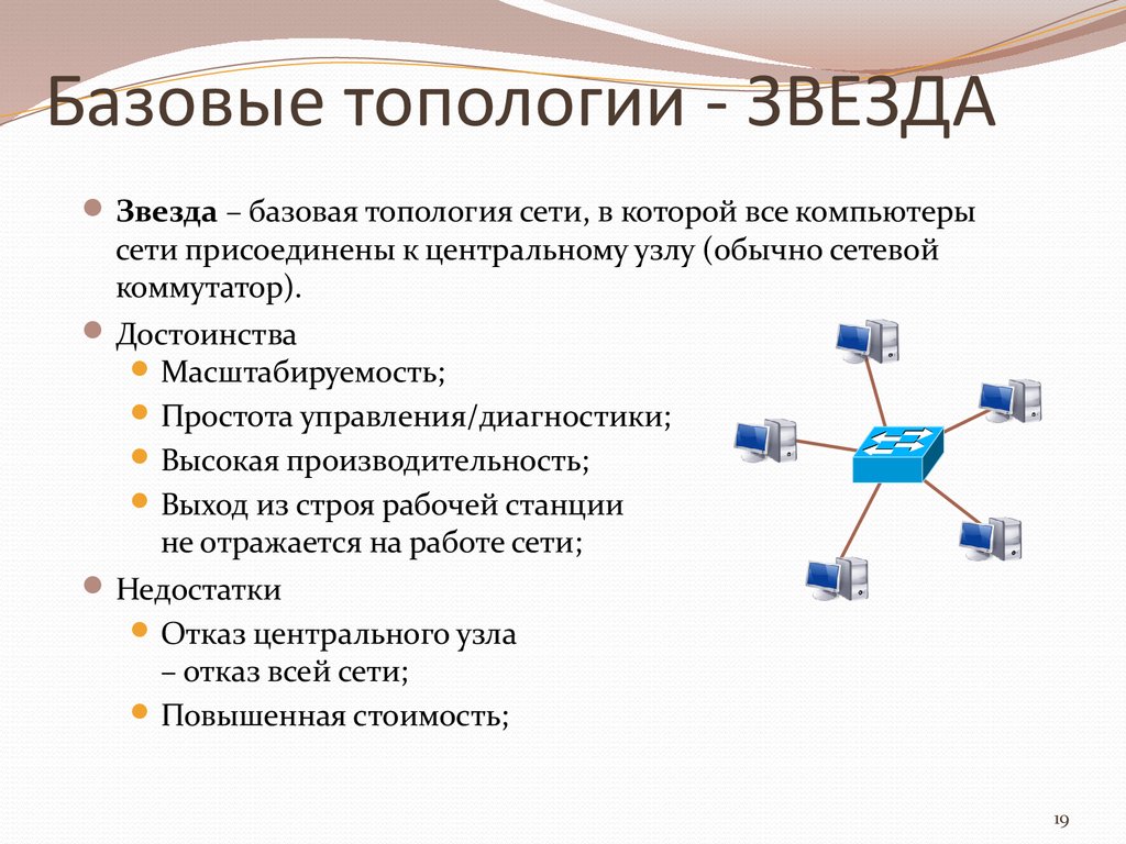 В данной топологии коммутатор выступает центральным узлом, через который осуществляется передача данных между остальными узлами.