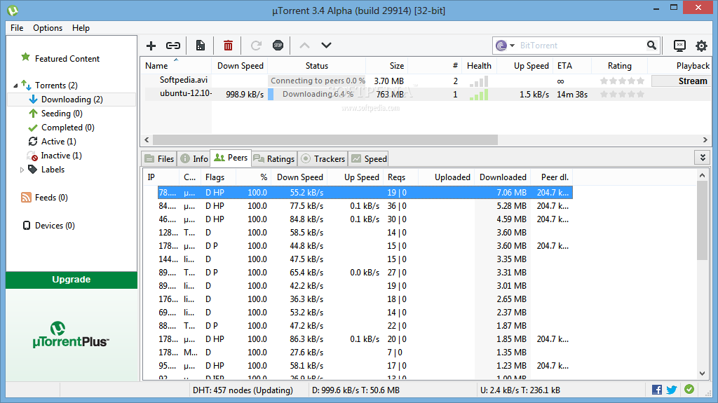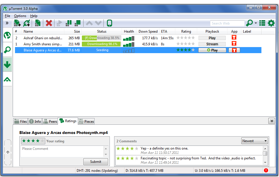 uTorrent 3 позволяет вам воспроизводить мультимедиа в потоковом режиме при загрузке, оценивать и комментировать торрент-файлы, перетаскивать файлы для обмена ими и отключать трекер UDP.