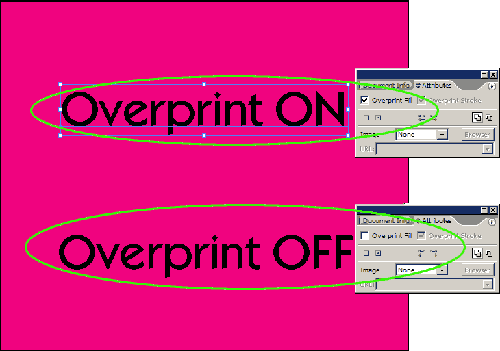 Наиболее часто в препресс-практике применяется атрибут Overprint Black (оверпринт 100% черного цвета), поскольку это самая темная краска из четырех базовых цветов и непрокрашенные зазоры на контрасте с ней виднее всего. Однако черная краска тоже не кроющая и под большими черными объектами цветной фонбудет просвечивать, поэтому оверпринт черного назначают там, где это незаметно: на текст 12–14 pt или линии и обводки 3–6 pt.