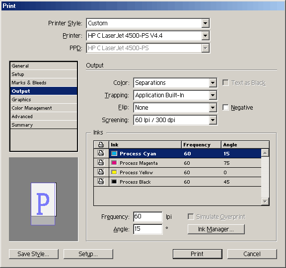 Если вы хотите задать наложение черного цвета во всем документе, сделайте то же самое, а затем выберите Always Overprint Black. В результате объекты, содержащие более 95% черного цвета, будут печататься с наложением. Для того чтобы изменить значение порога для черного цвета, щелкните на Options в окне диалога Print, выберите Overprint Black Threshold из списка Special Settings Option и измените значение порога. В окне диалога Separations вы можете также выбрать Use Advanced Settings, где есть возможность задать выполнение треппинга для каждого триадного цвета, вид треппинга, при котором параметры треппинга различны для каждого триадного цвета. Щелкните на триадный цвет, который вы хотите печатать с наложением, и отметьте Overprint Color, указав, что вы хотите печатать с наложением — текст, изображения или и то, и другое.