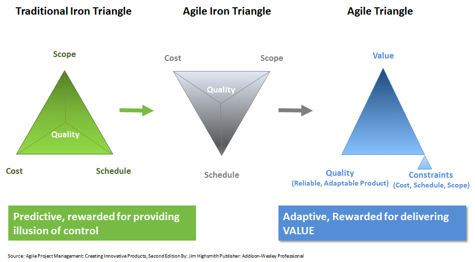 Классический Железный Треугольник говорит, что качество страдает, если любая из трех сторон перемещается независимо от других, но я лично могу поручиться, что плохое качество также является результатом отказа подвинуть любую из трех сторон перед лицом неизбежных изменений проекта.
