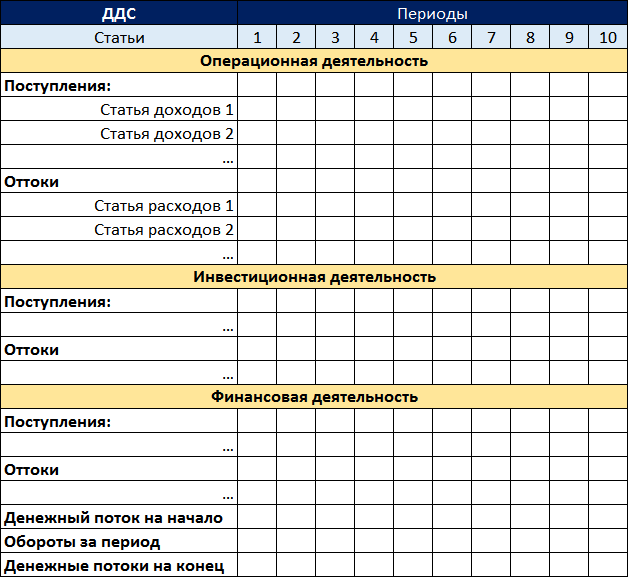 Для каждой группы статей по видам деятельности необходимо добавить отдельные группировки статей, по которым деньги поступают в компанию и происходят выплаты. Таким образом, вы сможете наглядно контролировать положительный денежный поток и происходящие выплаты. Это удобно при анализе БДДС, если, например, в течение года изменилась структура поступлений по различным статьям, но общая сумма поступлений превышает бюджет.