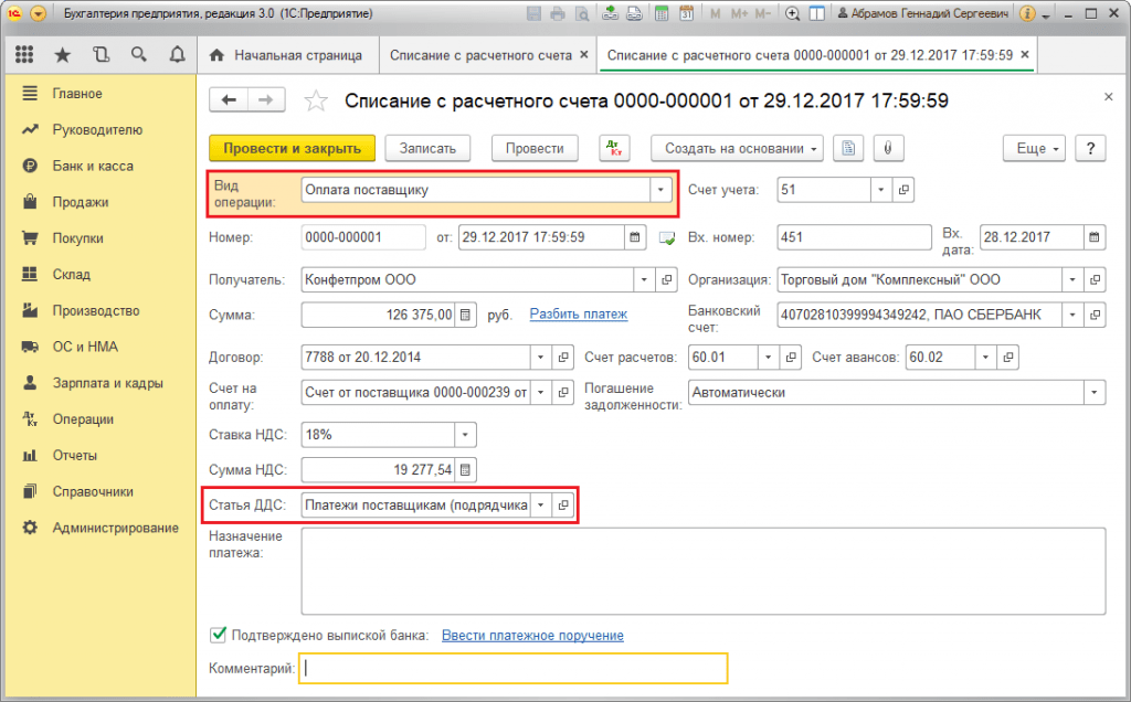 Теперь для примера создадим расходный кассовый ордер по оплате поставщику. При заполнении поля Статья ДДС наша статья Оплата поставщику (нематериальные активы) доступна для выбора в кратком отфильтрованном списке, согласно настроек, в Статье ДДС по типу хозяйственной операции.