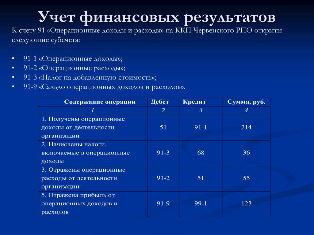 На субсчете 99-2 учитывают (отражают) прибыли и убытки от операционной деятельности, выявленные на счете 91 «Прочие доходы и расходы» (например, от продажи и прочего списания основных средств, нематериальных активов, от продажи материалов, ценных бумаг и др.).
