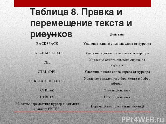 Любые выделенные фрагменты документа, в том числе и нетекстовые объекты, можно удалять, перемещать из одной части документа в другую, копировать. При этом активно используется буфер обмена Windows. Удаление, копирование и перемещение символов и выделенных фрагментов с помощью клавиатуры осуществляется комбинациями клавиш, приведенными в таблице 1.