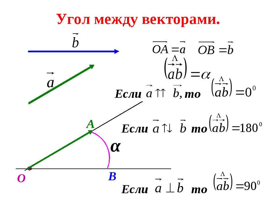 αмежду двумя векторами может быть записан как:α = arccos[(xa · xb + ya · yb + za · zb) / (√(xa² + ya² + za²) · √(xb² + yb² + zb² ))]Математика — угол между векторами