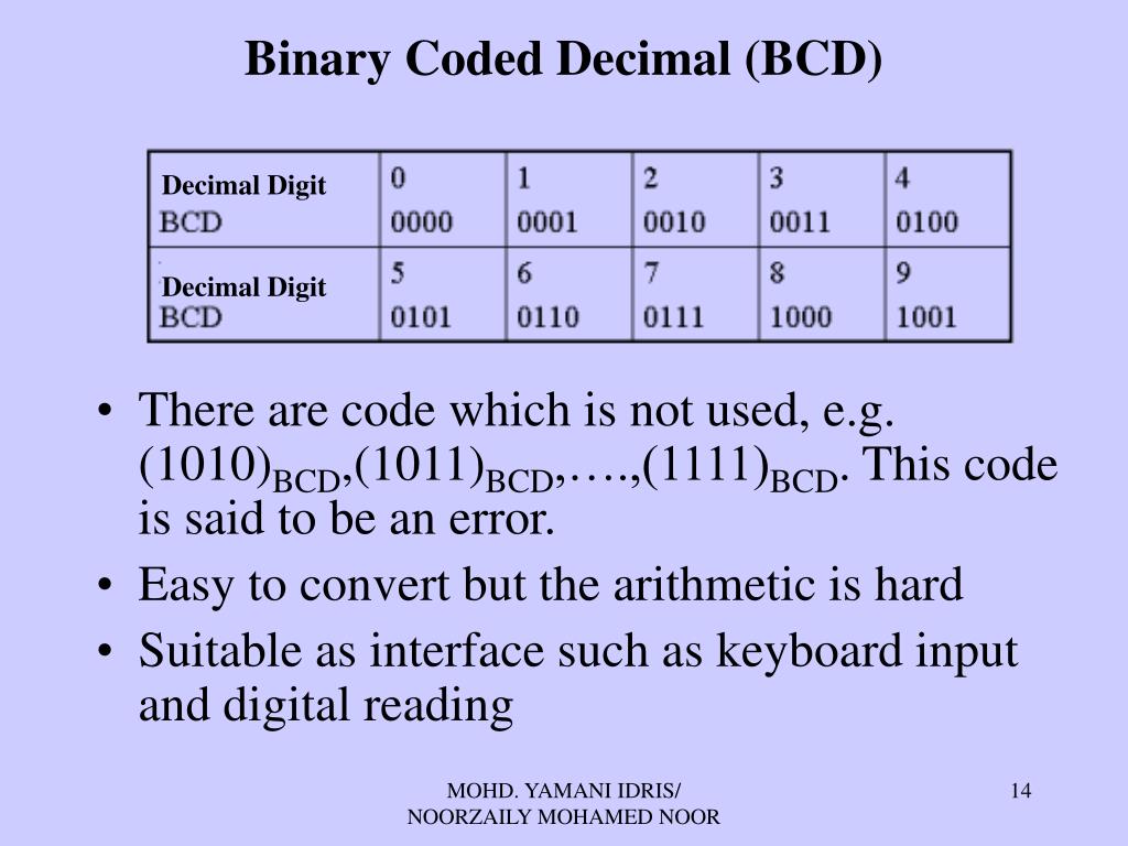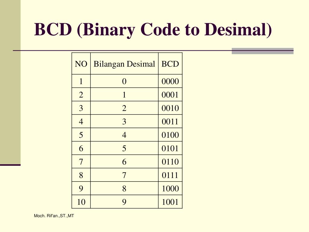 Обычно BCD представляются четырьмя битами или цифрами, начинающимися с 0000 до 1001, которые эквивалентны десятичным числам от 0 до 9 соответственно. Это также называется кодировкой 8421 двоично-десятичных чисел. Это было объяснено в таблице ниже.