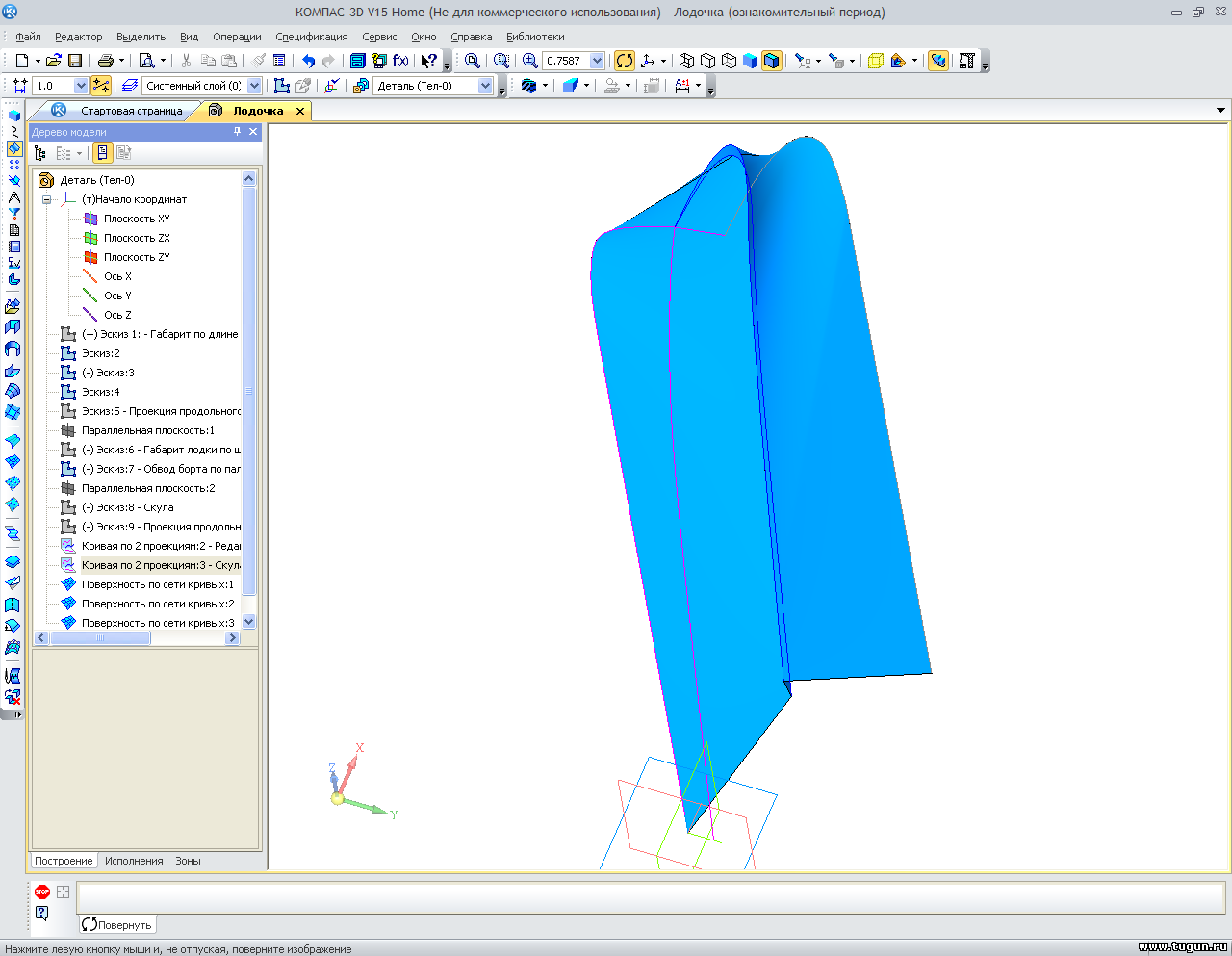 Используя команду Автолиния или Отрезок, строим в эскизе контур паровоза, ограниченный спроецированными прямыми.