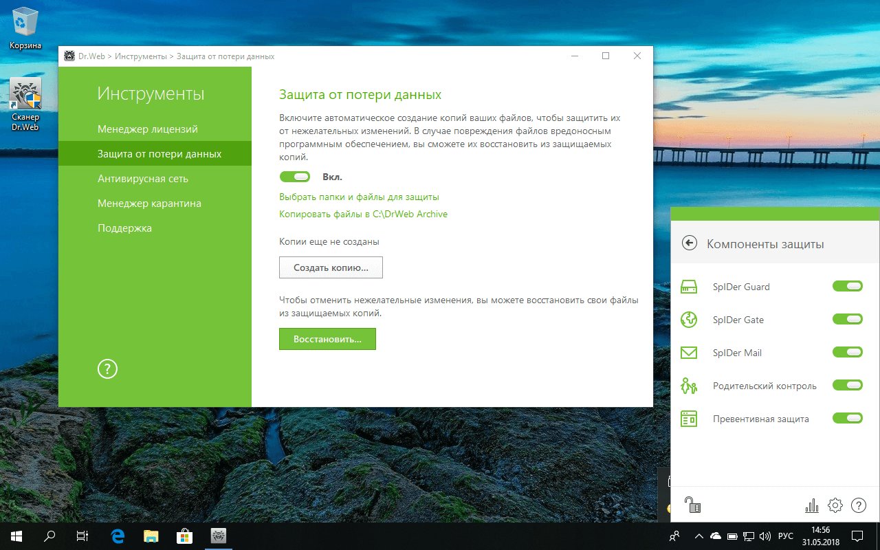 Dr.Web практически не влияет на производительность компьютера, работает со всеми известными архивами и упакованными файлами, а также поддерживает копирование важных данных в защищенное хранилище. Возможна установка Dr.Web на зараженную машину.