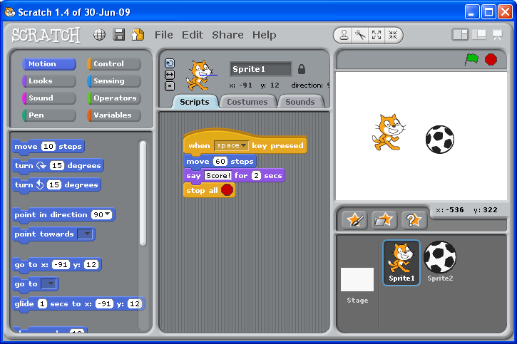 Все блоки, которые соединяются вместе, называются сценарием . В простых программах может быть только один или два сценария, тогда как в более сложных программах может быть много сценариев. - Теперь у вас достаточно информации, чтобы начать писать сценарии и экспериментировать со Scratch. Откройте среду программирования Scratch и начните экспериментировать.