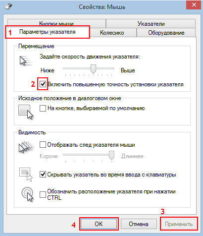 Переходим на вкладку «Параметры указателя» и в поле «Видимость» отмечаем галочкой пункт «Отображать след указателя мыши». Перемещаемся по пунктам с помощью клавиши Tab, или стрелочек, а галочку ставим пробелом.