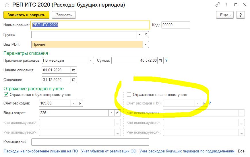 Налоговым законодательством не предусмотрено понятие РБП, однако имеется особый порядок признания некоторых затрат. Например, к таким расходам можно отнести финансирование на освоение природных ресурсов, НИОКР, страхование имущества, возникший при реализации амортизируемых активов убыток (ст. 261,262,263,268 НК РФ).