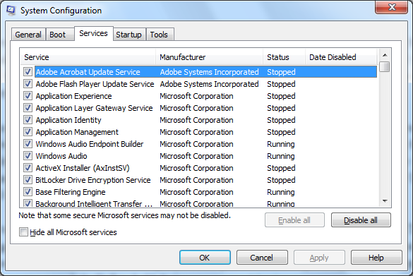 Чтобы сделать это, установите соответствующий флажок на Вкладка Общие , а затем перейдите к Службы или Запуск , щелкните Отключить все , а затем отметьте только один элемент. Вы перезагружаете компьютер и смотрите, не вызывает ли эта служба или элемент автозагрузки проблему в вашей системе. Если нет, вы снова переходите на вкладку Services или Startup и проверяете другой пункт. Продолжайте этот процесс, пока не найдете проблемную службу или элемент автозагрузки.