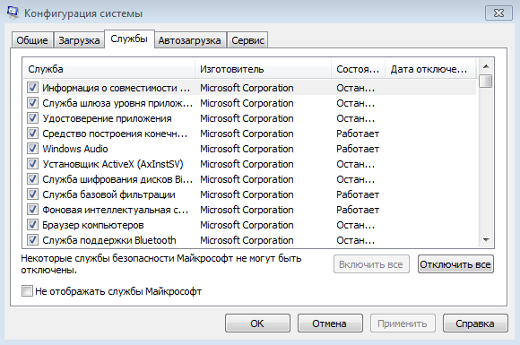 Раздел «Службы» – используется для включения и отключения всех служб операционной системы. В процессе диагностики системы можно отключить некоторые службы для выявления причин неисправностей. Чтобы скрыть системные службы, установите галочку «Не отображать службы Майкрософт». После этого на вкладке «Общие» установите режим «Выборочный запуск» и включите пункт «Загружать системные службы». На вкладке «Службы» отключите все остальные пользовательские службы, перезагрузите компьютер. Если после этого проблемы не возникают, то причиной являются именно пользовательские службы. Теперь последовательно включая службы, вы легко определите источник проблем. Если же проблема не исчезает, то причина кроется в системных службах. Отключите все службы и потом последовательно включайте их, чтобы выявить источник сбоя системы.
