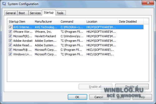 Вкладка «Автозагрузка» — самая любимая вкладка, и это единственная причина, по которой я вообще использую утилиту MSCONFIG. Меня поражает, насколько медленны некоторые клиентские компьютеры из-за огромного количества запускаемых программ. Даже если у меня их много, я обычно отключаю 80 процентов из них, потому что они не нужны.
