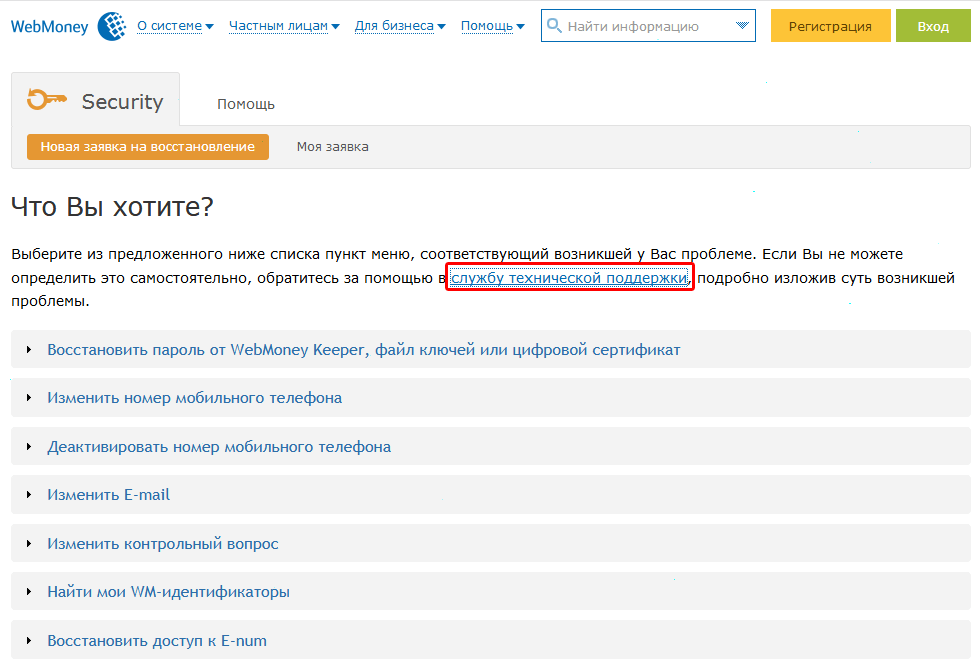Помощь сотрудников техподдержки Вебмани может потребоваться в таких вопросах, как: