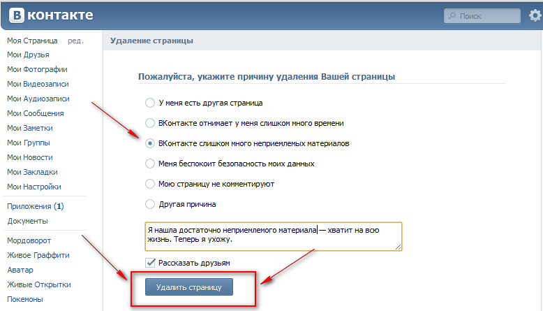 Если ты нажмешь на галочку Рассказать друзьям, ты уберешь ее, и твои друзья даже не узнают сразу, что твоя страница удалена.