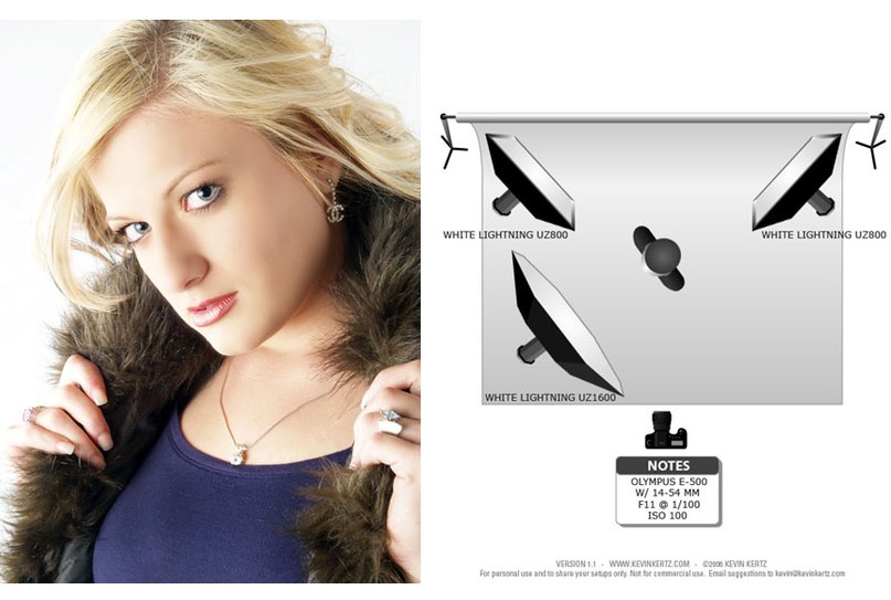 В этом случае потребуется три осветительных элемента. Основной располагается спереди слева и ставится под углом примерно 45 градусов. Причем, свет не направляется на объект съемки, а отражается от зонта, создавая рассеянный световой поток.