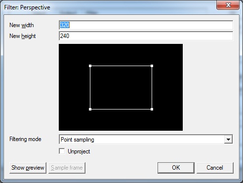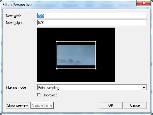Вокруг выбранного кадра есть рамка с активными углами. Перетаскивая эти активные квадратики нам нужно обвести ту часть кадра, которую мы хотим оставить. Все делается на глаз, но результат применения фильтра можно сразу посмотреть в картинке после обработки в окне основной программы. Выбираем метод обработки изображения «Filtering mode». В нашем случае «Bilinear» вполне достаточно. Есть еще такая галочка «Unprodject». Если ее не установить, то изображение будет сжато относительно исходного размера пропорционально выделенной области.