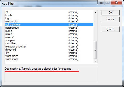 Заходим в меню «Video» и выбираем «Filters…». В списке фильтров выбираем фильтр «Null transform», который не производит совершенно никакой обработки видео, но зато позволяет использовать функцию обрезки кадров.