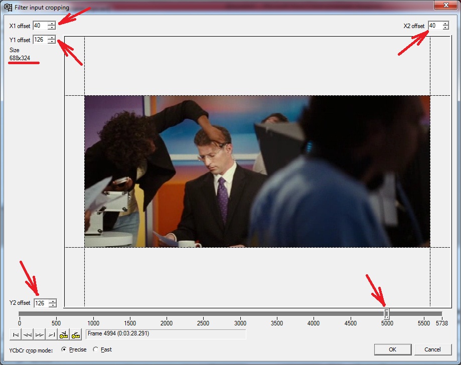 В полях, отвечающих за каждую сторону кадра, вводим число пикселей, которое нужно отсечь, либо нажимаем мышкой на стрелочки возле этих областей, постепенно меняя количество пикселей обрезки. После отсечения ненужных частей кадра, смотрим получившийся размер кадра. Каждая сторона кадра должна иметь четное число пикселей. При необходимости нужно подкорректировать соответствующую область обрезки.