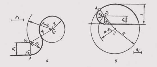 Здесь может быть рассмотрено два случая: внешнее сопряжение (рисунок 37, а) и внутреннее (рисунок 37, б). В том и в другом случае при построении сопрягающей дуги радиуса R центр сопряжения О лежит на пересечении геометрических мест точек, равно удаленных от прямой и дуги радиуса R на величину R1.