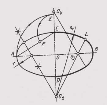 на котором отложим разность СЕ большой и малой полуосей овала. Проведем перпендикуляр к середине отрезка AF, который пересечет большую и малую оси овала в точках О1и О2. Эти точки будут центрами сопрягающихся дуг овала, а точка сопряжения будет лежать на самом перпендикуляре.