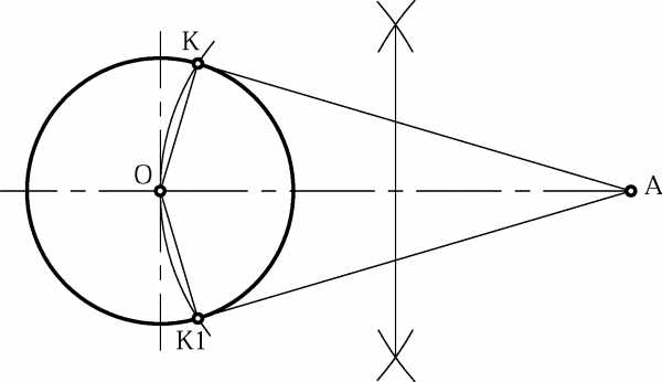 Данную точку А соединяют с центром окружности О и из точки А через центр О очерчивают вспомогательную окружность. В точках пересечения вспомогательной и данной окружностей получают точки касания К и К1; остаётся точку А соединить с этими точками (рис. 2.10).