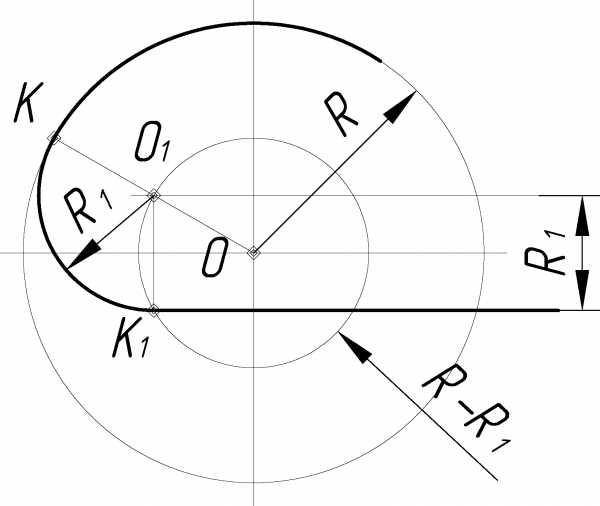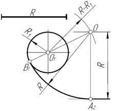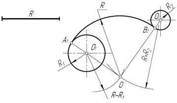 Построение внутреннего сопряжения отличается тем, что из центра О проводят вспомогательную дугу радиусом, равным R — R1.