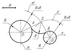 Пример 1. Построим сопряжение с внешним касанием двух данных окружностей m и n с радиусами R1и R2дугой заданного радиуса R (рис. 20).