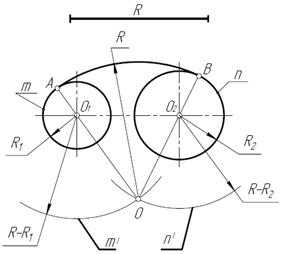 Пример 2. Построим сопряжение с внутренним касанием двух данных окружностей m и n с радиусами R1и R2дугой радиусом R (рис. 21).