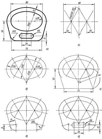 Перед вычерчиванием любого контура необходимо установить, из каких линий и их сочетаний он состоит, а также решить, какие геометрические построения следует выполнить при вычерчивании контура. Только после подобного анализа можно приступать к построению контура.