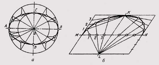 Можно привести пример построения эллипса по двум сопряженным диаметрам (рисунок 39,б) MN и KL. Сопряженными два диаметра называют, если каждый из них делит пополам хорды, параллельные другому диаметру. На сопряженных диаметрах строят параллелограмм. Один из диаметров MN делят на равные части; на такие же части делят и стороны параллелограмма, параллельные другому диаметру, нумеруя их, как показано на чертеже. Из концов второго сопряженного диаметра KL через точки деления проводят лучи. В пересечении одноименных лучей получают точки эллипса.
