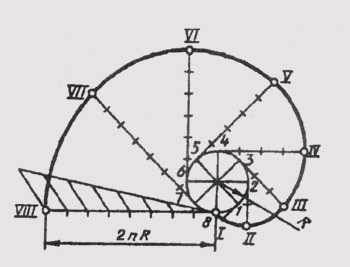 Эвольвентойназывают плоскую кривую, являющуюся траекторией любой точки прямой линии, перекатываемой по окружности без скольжения. Построение эвольвенты выполняют в следующем порядке (рисунок 43): окружность делят на равные части; проводят касательные к окружности, направленные в одну сторону и проходящие через каждую точку деления; на касательной, проведенной через последнюю точку деления окружности, откладывают отрезок, равный длине окружности 2лR, который делят на столько же равных частей. На первой касательной откладывают одно деление 2лR/n , на второй — два и т. д.
