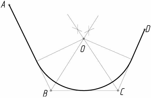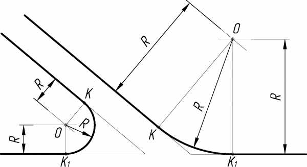 Этими точками и ограничивается дуга сопряжения. Если одна из точек касания, например К, является заданной, а радиус закругления не указан, то искомый центр О находится на пересечении перпендикуляра, проведенного из точки К, и биссектрисы угла, образуемого данными прямыми.