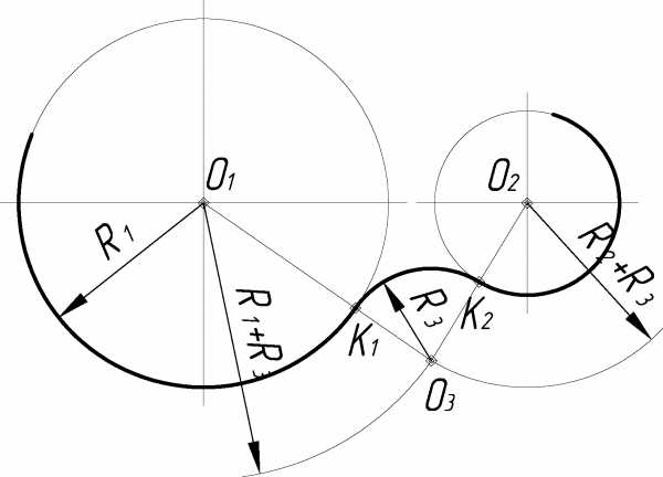 При внешнем касании (рис. 2.8) из центра О1 окружности радиусом R1 описывается дуга вспомогательной окружности радиусом R1+ R3 и из центра О2 окружности радиусом R2 – дуга радиусом R2 + R3. Точка О3 пересечения этих дуг является центром искомой дуги окружности радиусом R3. Соединяя центры О3 и О1, а также О3 и О2, определяют точки касания К1 и К2.
