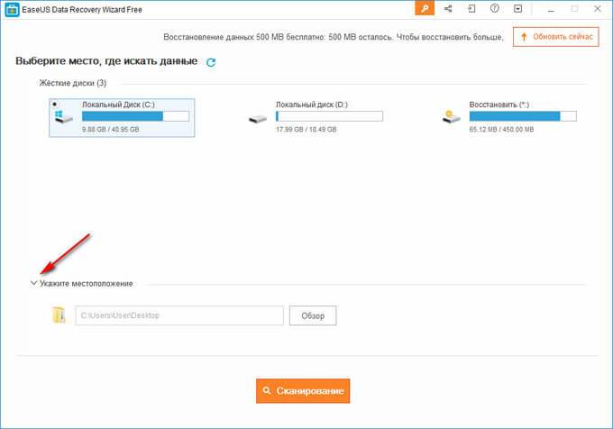 Чтобы восстановить данные на компьютере, необходимо выбрать место, где вы потеряли данные. Здесь выберите жесткий диск на вкладке «Жесткие диски» или рабочий стол на вкладке «Выбор местоположения». Нажмите «Пуск», чтобы начать сканирование в выбранном месте.