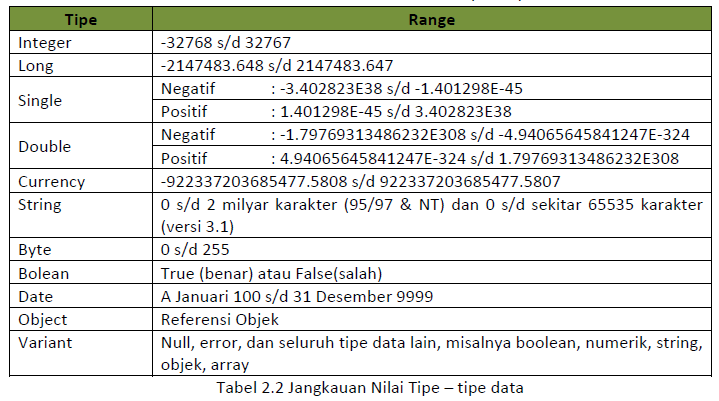 Это полезная таблица для справки, когда вы привыкнете к типам переменных VBA.