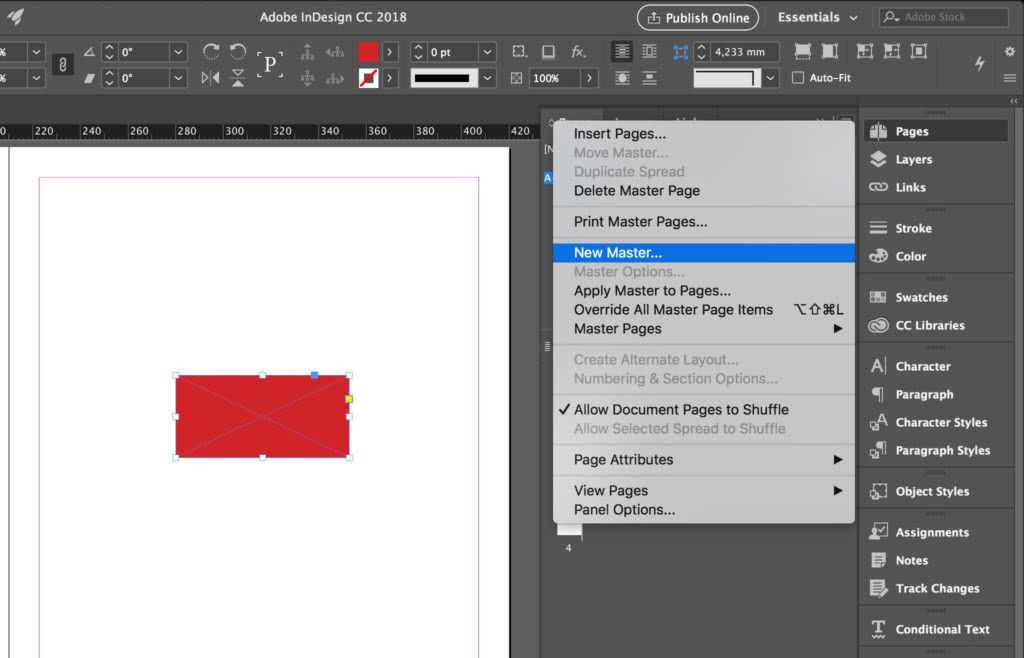 Откройте меню «Окно», найдите его подменю «Объект и макет» и выберите «Навигатор», чтобы открыть одноименную панель. Активируйте инструмент «Выделение» в наборе инструментов Adobe InDesign.
