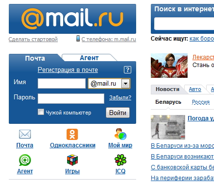 ru, но и ряд других), чем не может похвастаться практически ни один существующий конкурент. - Доступ к другим возможностям, таким, как облако, компьютерные игры и даже к социальной сети «Одноклассники» без прохождения дополнительной регистрации, для входа в данные сервисы достаточно воспользоваться логином и паролем от почтового ящика.