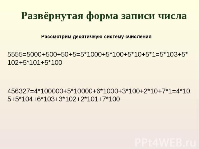 Число 5921 можно записать в следующем виде: 5921 = 5000+900+20+1 = 5·103+9·102+2·101+1·100. Число 10 является характеристикой, определяющей систему счисления. В качестве степеней взяты значения позиции данного числа.