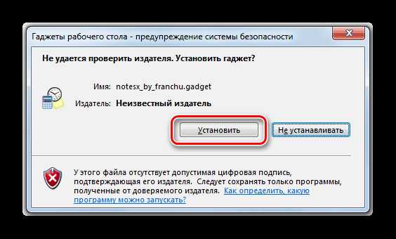 - Запустите закачанный файл под названием «long_notes.gadget». В открывшемся окошке установки, как всегда, жмите «Установить».