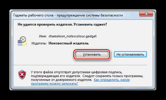 - Запустите закачанный файл с расширением gadget. В открывшемся диалоговом окне нажимайте «Установить».