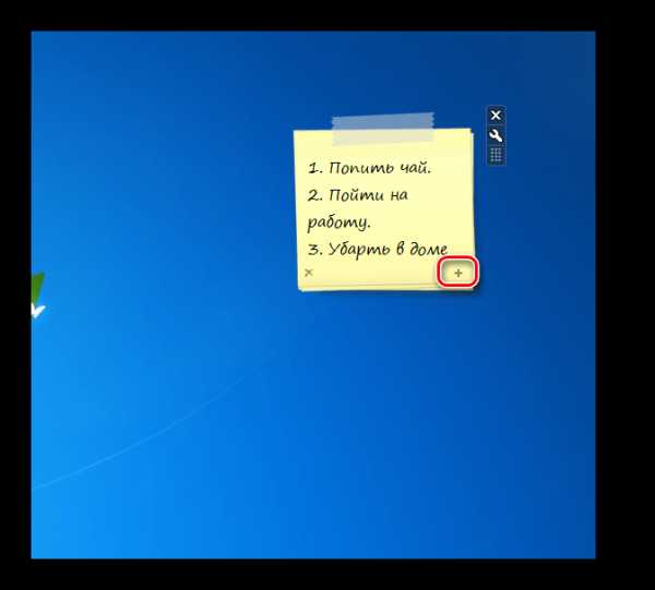 - При наведении курсора на оболочку стикера в его нижнем правом углу отобразится элемент в виде значка «+». Его следует нажать, если вы хотите создать ещё один лист с заметками.